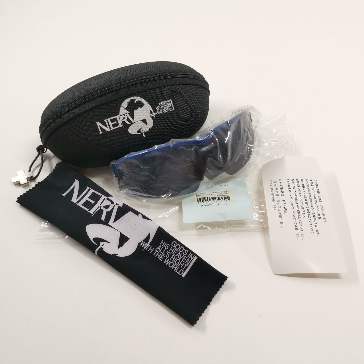 13,0 yen (US$) JAN;サングラス本体 ケース 眼鏡拭き 解説 フレームカラーはブラック。 付属のケース、眼鏡拭きには葛城ミサト着用の帽子のエンブレムを刻印。 商品的には高い機能性と実用性を兼ね備えたモデルと 葛城ミサトのサングラスをオリジナルイメージそのままに再現! シンジを迎えに来た時にかけている、あのカッコ良いサングラスです! 「版権許諾証 gainax official licensed」のラ